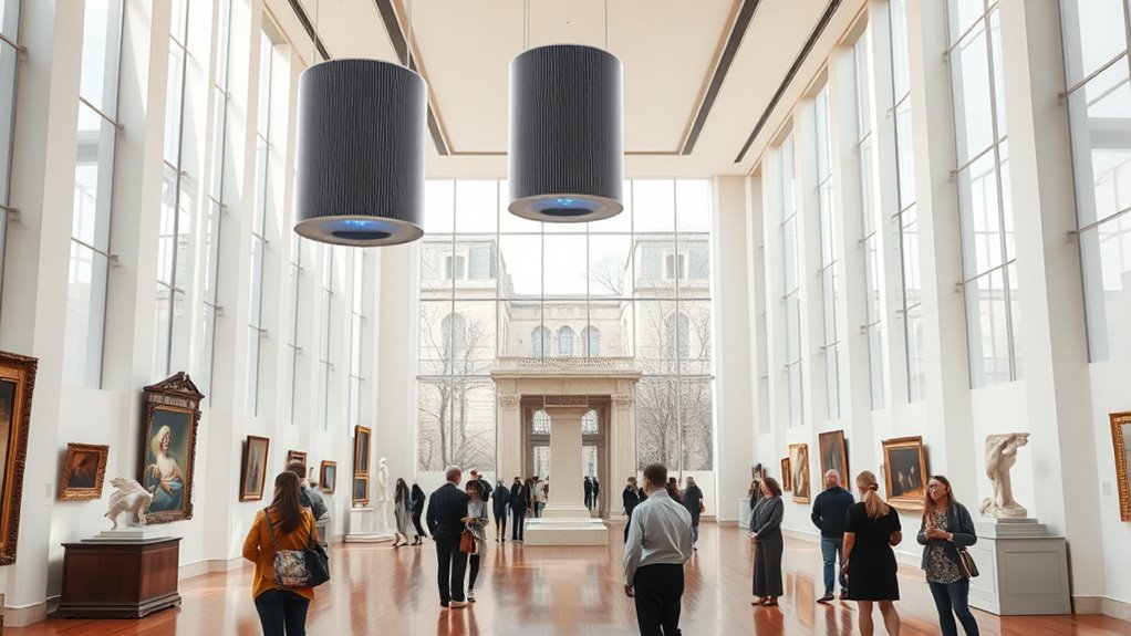 In museums and galleries, effective air purification is essential to protect your valuable artworks and ensure visitor safety. By filtering out dust, pollen, VOCs, and airborne pollutants, air purification systems help maintain a clean environment and reduce the risk of deterioration caused by pollutants and humidity fluctuations. Limiting visitor numbers also supports cleaner air quality. If you want to know how these systems work together for maximum preservation, keep exploring the key strategies behind a secure, healthy space.
