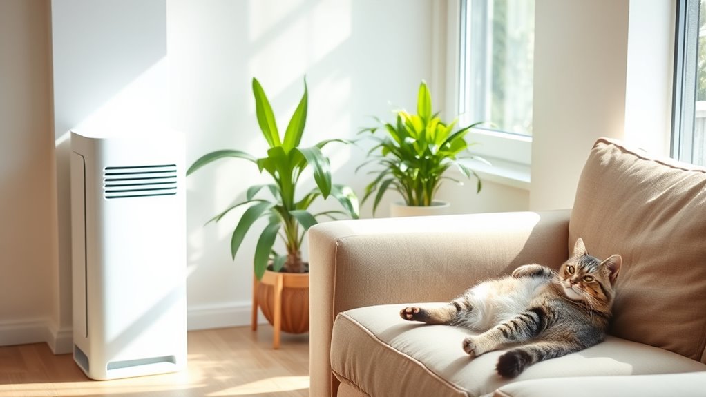 Air purifier maintenance is vital for ensuring ideal pet odor absorption. Over time, filters collect dust, hair, dander, and odor-causing particles, which diminishes their effectiveness. Regularly replacing or cleaning filters keeps your air purifier functioning at its best. HEPA filters, especially, are excellent at capturing pet dander and airborne particles that contribute to odors. Activated carbon filters are equally important because they absorb volatile organic compounds and other smells emitted by pets. Without proper maintenance, these filters become clogged, and your purifier’s ability to eliminate pet odors diminishes considerably. So, check your manufacturer’s instructions for how often to change or clean your filters, and stick to that schedule.