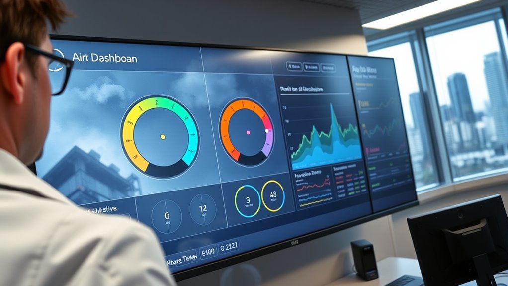 Air quality dashboards visualize real-time pollution data from sensors across your community, giving you instant insights into air quality levels. They display information like particulate matter, nitrogen dioxide, and ozone through color-coded maps and graphs, making it easy to interpret pollution trends and spikes. Proper sensor calibration guarantees data accuracy, which builds trust in what you see. Understanding how these dashboards work helps you make safer outdoor choices—if you keep exploring, you’ll discover how these tools truly benefit your health.