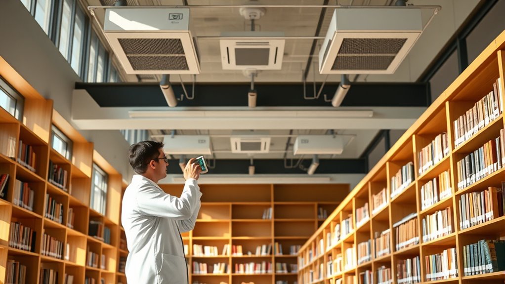 You’ll find that air quality standards differ between libraries and archives mainly to protect environmental impact and staff health. Archives require stricter controls because their materials are more sensitive to pollutants, so you’ll implement lower VOC limits and better humidity controls. In libraries, standards focus on reducing dust and mold to prevent damage and ensure a healthy environment for staff and visitors. Adjusting standards based on activity and material sensitivity helps safeguard both environments effectively.
