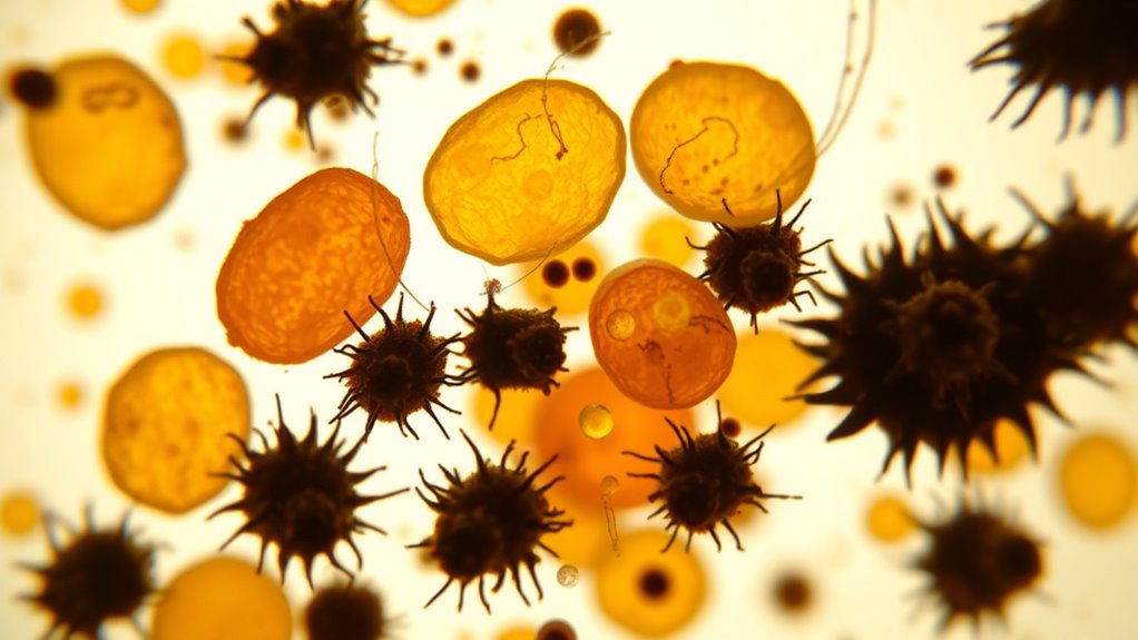 Chronic indoor spore exposure can cause continuous complications, compromising your respiratory health and triggering persistent problems. You might notice increased immune responses, leading to allergies, asthma, or other respiratory irritations. Over time, these spores can subtly strain your immune system, making you more vulnerable to infections. To protect yourself, maintain proper humidity, guarantee good ventilation, and regularly clean to reduce spore buildup, safeguarding your long-term health and breathing ease.