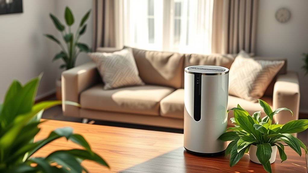 Understanding filter efficiency ratings is essential for selecting an air purifier that meets your specific air quality needs. These ratings indicate the percentage of airborne particles a purifier can remove; higher ratings mean better filtration performance. For instance, HEPA filters boast an impressive 99.97% effectiveness, capturing particles as tiny as 0.1 microns, like pollen, dust, and pet dander. When combined with CADR (Clean Air Delivery Rate) ratings, you get a thorough view of how well an air purifier can tackle pollutants like smoke, dust, and pollen quickly. Filters with certified efficiency ratings guarantee consistent performance and compliance with safety standards, reducing the risk of particle breakthrough. Knowing these ratings helps you choose an effective purifier for cleaner air.