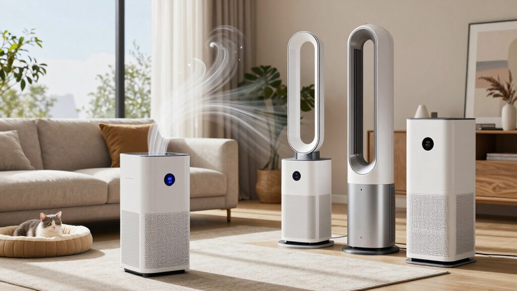 So, if you’re tired of battling a never-ending fog of cat allergies, think of these purifiers as your allergy-fighting superheroes. They swoop in, trap the tiny invaders, and turn your home into a sanctuary of fresh, breathable air. With the right purifier, you’ll reclaim your space and breathe easy again—like opening a window to a clear, sunlit sky after a long storm. Your allergy-free haven is just a filter away!