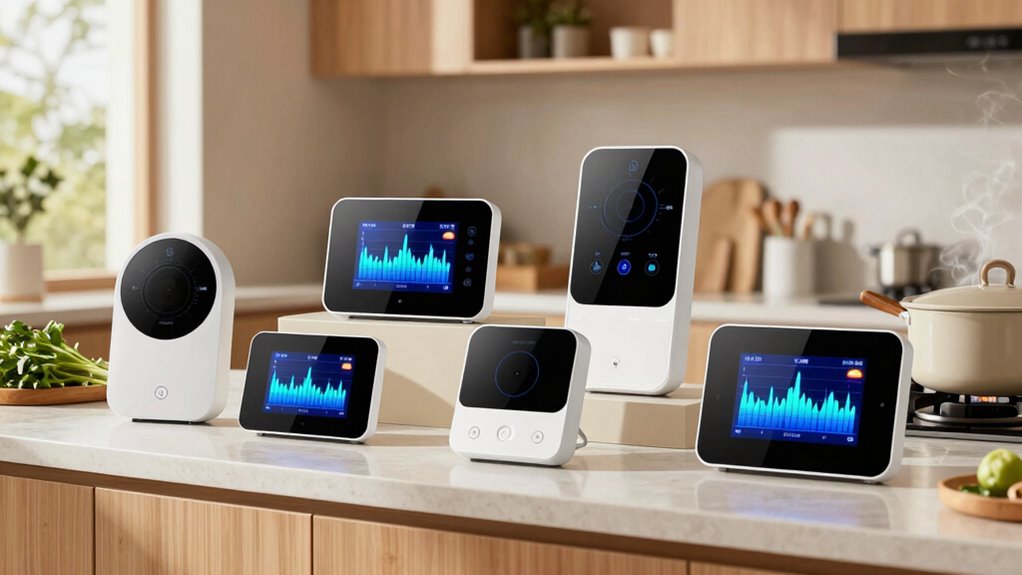 Air quality monitors detect cooking-related pollutants by using sensors like electrochemical, metal oxide, or photoionization detectors that identify specific gases such as VOCs, smoke, and particulate matter. When I cook, these sensors pick up increased pollutant levels and trigger alerts. They continuously analyze the air, enabling me to take quick action, like opening windows or turning on a vent, to maintain a healthy environment in my kitchen.