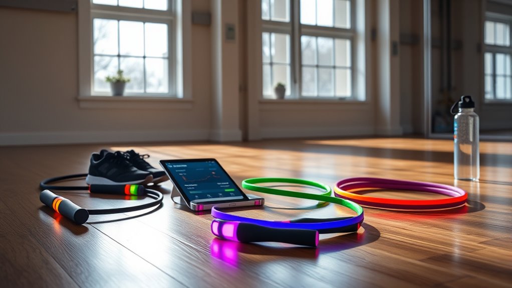 After finding the right weight and portability for your smart jump rope, the next step is to explore the versatile workout modes it offers. I love that these ropes provide multiple options, like free jump, timed sessions, and target jump counts, which let me customize my routine. Adjustable speed settings are a game-changer, allowing me to switch between high-intensity interval training and steady-state cardio with ease. Some models even come with preset programs that guide me through progressively challenging workouts tailored to my fitness goals. The ability to seamlessly shift between modes keeps my sessions fresh and engaging, whether I’m building skills or boosting endurance. Plus, real-time data tracking helps me monitor my progress and make necessary adjustments for ideal results.