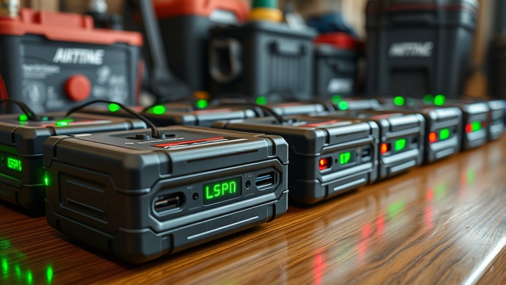When choosing a battery maintainer for seasonal storage, considering power consumption and efficiency is essential to keep long-term costs and energy waste in check. A highly efficient maintainer reduces energy use during extended storage, lowering electricity bills. Multi-stage charging algorithms optimize energy use by adjusting current and voltage to match the battery’s needs, preventing unnecessary waste. Maintainers with automatic shutoff features cut power once the battery is full, conserving energy and preventing overcharging. Devices with low standby current draw are ideal for long-term storage, as they minimize energy loss when idle. Additionally, energy-efficient maintainers often meet certifications like ENERGY STAR, indicating they’re designed to consume less power while maintaining performance. Choosing a low-consumption maintainer helps save money and supports energy conservation.