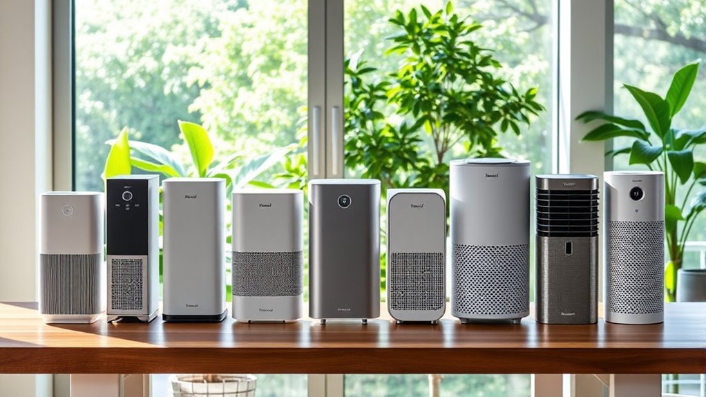 Finding the right air purifier involves more than just evaluating noise levels; energy consumption is another key factor. When I look for CARB-compliant purifiers, I always check their energy efficiency. These models must meet strict standards, which often means they’re also Energy Star rated. This rating indicates they use less electricity while still delivering excellent filtration performance. Typically, efficient purifiers consume between 30-70 watts during operation, which helps lower my electricity bills and reduces environmental impact over time. I also appreciate purifiers with eco or sleep modes, as they automatically adjust power use during low air quality or nighttime. This way, I can enjoy clean air without stressing about energy costs!