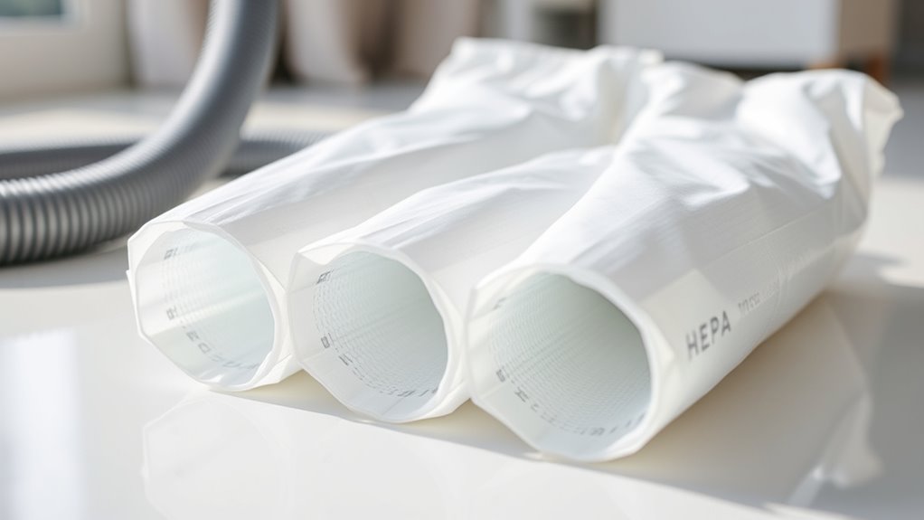 Choosing a central vacuum HEPA bag with the right filtration efficiency is crucial for effective air purification. HEPA filtration efficiency measures how well a bag captures 99.97% of particles as small as 0.3 microns, including allergens and microscopic pollutants. Higher efficiency levels mean cleaner air and healthier living spaces. Look for bags that meet industry standards, like HEPA or HEPA-like classifications, as these ensure reliable performance. Many high-quality bags feature multiple layers, including a dedicated HEPA layer for maximum particle retention. Regularly replacing these bags ensures your vacuum maintains ideal airflow and filtration, preventing dust buildup and performance loss. Prioritizing efficiency helps you achieve a truly deep clean and keeps your home’s air fresh and healthy.