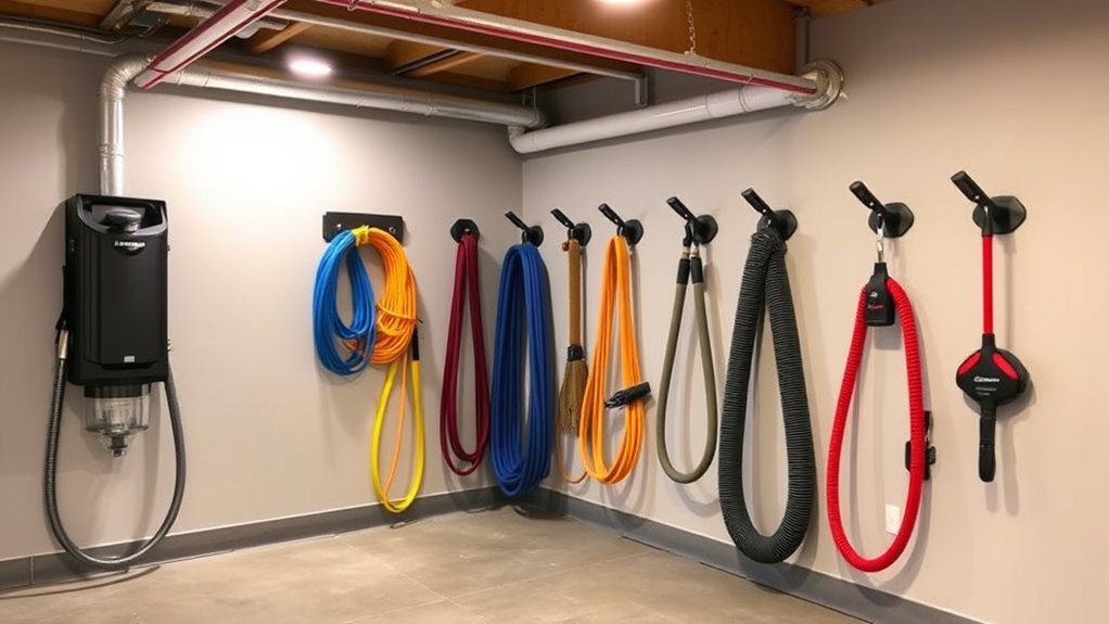 Planning the right pipe length and size is essential for a successful DIY central vacuum installation. The total pipe length depends on your home’s size and layout, usually ranging from 30 to 100 feet for residential systems. I recommend using 2-inch diameter pipes, as they strike a good balance between airflow efficiency and ease of installation. Proper planning guarantees you cover the entire space without excessive joints, which can hinder performance. Longer runs might need extra fittings or support to prevent sagging and maintain system integrity. It’s also wise to include some extra pipe length for future expansion or modifications. This way, your system remains efficient and adaptable, providing reliable cleaning power throughout your home.