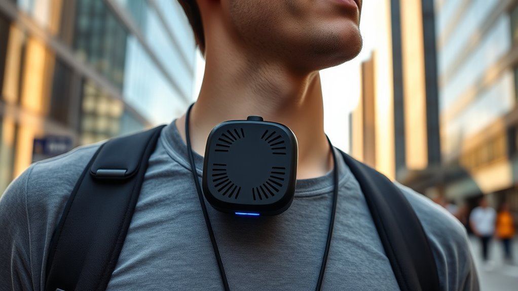 When selecting a cordless personal air purifier, it is vital to prioritize design features that enhance portability and ease of use. Look for lightweight, compact models—ideally under 1 pound—to guarantee they’re easy to carry around without adding bulk. Adjustable handles or versatile placement options, like upright or side positions, let you adapt the device to different environments. User-friendly controls, such as simple buttons or touch interfaces, make switching modes quick and effortless. Durability is also key; choose devices with sturdy construction that can withstand daily use. Additionally, aesthetic appeal matters—sleek designs that match your personal or travel style. Bonus features like cooling functions, night lights, or aromatherapy can boost usability and create a more personalized experience on the go.