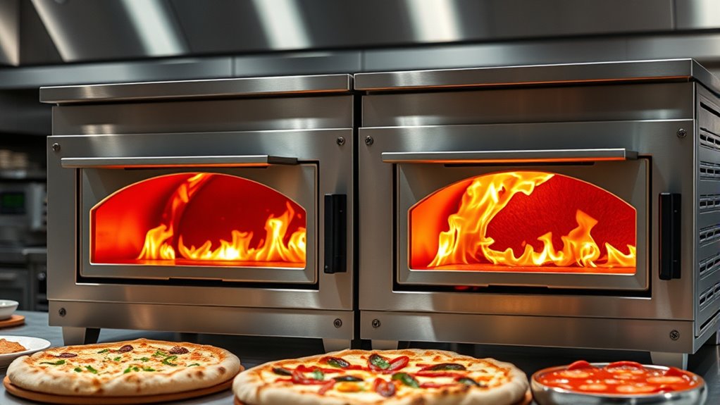 You might think ovens reaching ≥800°C are energy hogs, but I’ve found they can be surprisingly efficient. These ovens heat up quickly and retain high temperatures with good insulation, reducing overall energy use. While they consume more power during startup, their rapid cooking times save energy in the long run. So, if used wisely, they’re not only powerful but also reasonably efficient for creating perfect, crispy pizzas.