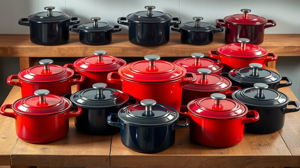 Enameled Dutch ovens have a smooth, non-stick surface that’s easy to clean and doesn’t need seasoning, making them low-maintenance. Non-enameled, or bare cast iron, requires seasoning to develop a natural non-stick coating and can handle higher temperatures. I find enameled versions perfect for convenience, while non-enameled ones excel in durability and heat retention, especially for rustic baking. Your choice depends on how much effort you want to invest.