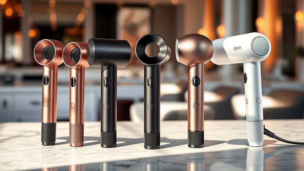 Since heat damage can considerably compromise hair health, selecting a Dyson Airwrap alternative with smart temperature control is essential. Look for devices that monitor and maintain safe heat levels, reducing the risk of overexposure. Ionic technology is also beneficial, as it neutralizes static and locks in moisture, preventing over-drying and frizz. Prioritize tools with multiple heat settings so you can customize the temperature based on your hair type, minimizing unnecessary high heat. Fast heat-up times and stable heat distribution are vital to avoid uneven temperature fluctuations that could harm your hair. Additionally, consider attachments or airflow-based styling methods that apply less direct heat, offering a gentler styling experience without sacrificing results. These features help protect your hair’s health while delivering salon-quality styles.