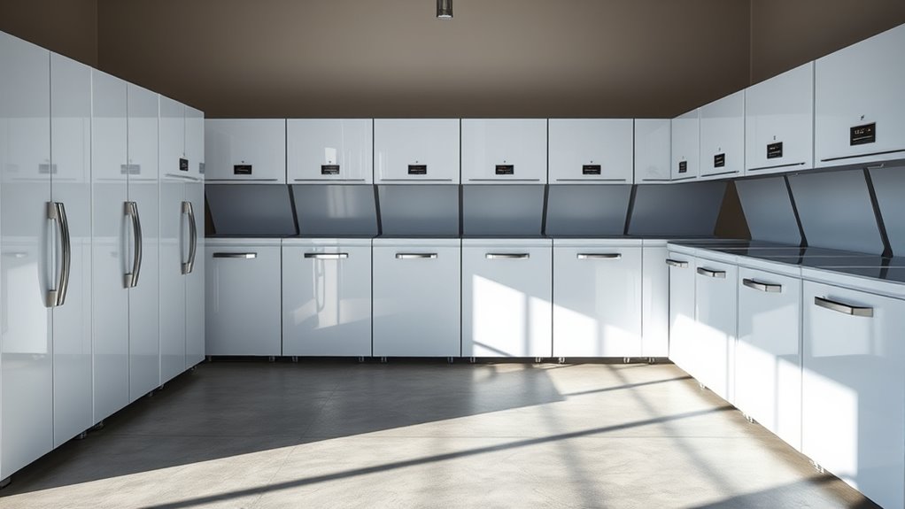 Choosing a garage-ready chest freezer involves considering its durability and build quality, especially if it’ll be exposed to fluctuating temperatures and harsh conditions. High-quality insulation is vital, as it helps maintain ideal temperatures despite external changes. Look for reinforced hinges and sturdy latches; these features guarantee the lid stays secure over time. A corrosion-resistant exterior, typically made from PCM or stainless steel, protects against moisture and outdoor elements. Additionally, robust construction with reinforced door seals prevents cold air leakage, which is essential for energy efficiency. Finally, ensure the freezer meets industry standards for impact resistance and long-term reliability, particularly in non-climate-controlled spaces. This way, you can trust that your investment will last and perform well.
