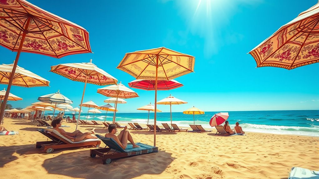 In my quest for the perfect beach day, I discovered that a high-end umbrella is like a trusty shield in a knight’s armor. It stands resilient against the sun’s harsh rays, allowing me to enjoy my sandy adventures without worry. Just like a knight wouldn’t venture into battle unarmed, I wouldn’t hit the beach without my stylish umbrella. So, invest wisely in your sun protection, and let your beach days be as carefree as a gentle ocean breeze.