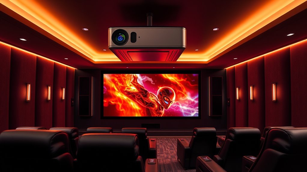 While resolution and image clarity set the foundation for a great home theater experience, brightness and ambient light conditions considerably influence how vivid and sharp your images appear. Brightness, measured in lumens or ANSI lumens, determines a projector’s ability to produce clear images in well-lit environments. For rooms with ambient light, I recommend at least 2,500 ANSI lumens to keep images vibrant and avoid washout. Higher brightness levels are vital in outdoor settings or daylight conditions, where 3,000 ANSI lumens or more ensure visibility and immersion. Ambient light impacts perceived image quality greatly, so choosing a projector with sufficient brightness is indispensable for achieving maximum clarity and color richness, especially when controlling lighting conditions isn’t always possible.