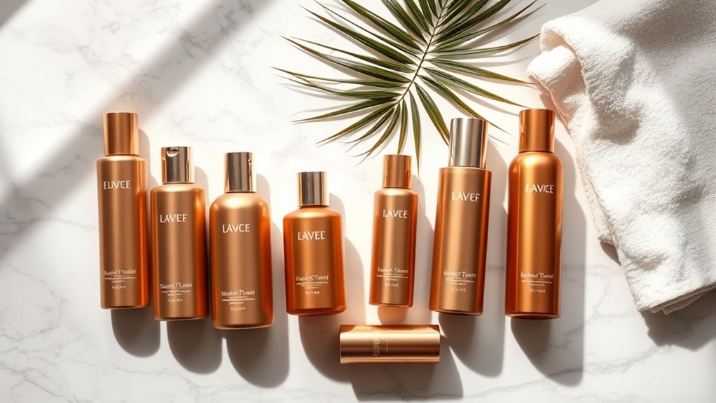Achieving your desired tan depth is only part of the equation; longevity of results also plays a significant role in your self-tanning experience. High-end self-tan products typically offer results that last between 7 to 11 days, meaning I don’t have to reapply as frequently. I find that formulas featuring advanced DHA and nourishing ingredients enhance adhesion, making my tan last longer. Before applying, I always exfoliate to guarantee an even application, which helps prevent fading or patchiness. Using products with hydrating ingredients like aloe vera or hyaluronic acid keeps my skin moisturized and prolongs the tan’s appearance. Plus, consistent moisturizing and gentle skin care after application are essential for maximizing the longevity of my high-end self-tan.