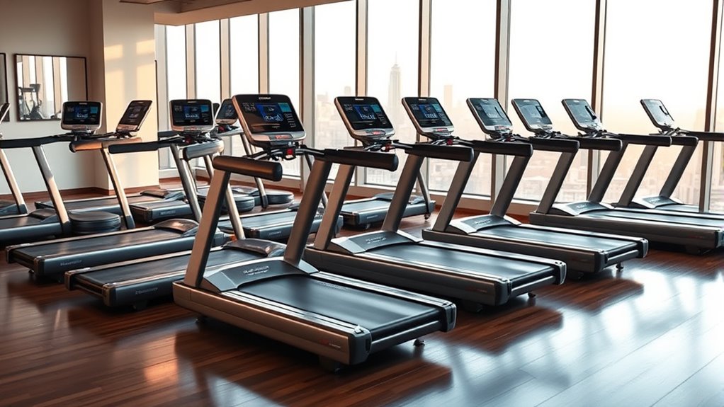 Choosing a high-end treadmill with incline means paying close attention to motor power and speed capabilities, as these features directly impact workout quality and versatility. High-end models typically have motors between 3.0 and 4.0 horsepower, guaranteeing smooth, consistent performance even during intense sessions. A powerful motor allows for higher maximum speeds, often exceeding 10 MPH, which is essential for fast running and sprinting. Variable speed control with precise adjustments lets you seamlessly tailor workout intensity without interruption. Durability and quality of the motor are vital, especially for frequent or long-duration use, as they guarantee sustained performance over time. Overall, a robust motor and high top speeds broaden your training options, accommodating a wide range of fitness levels and training goals.