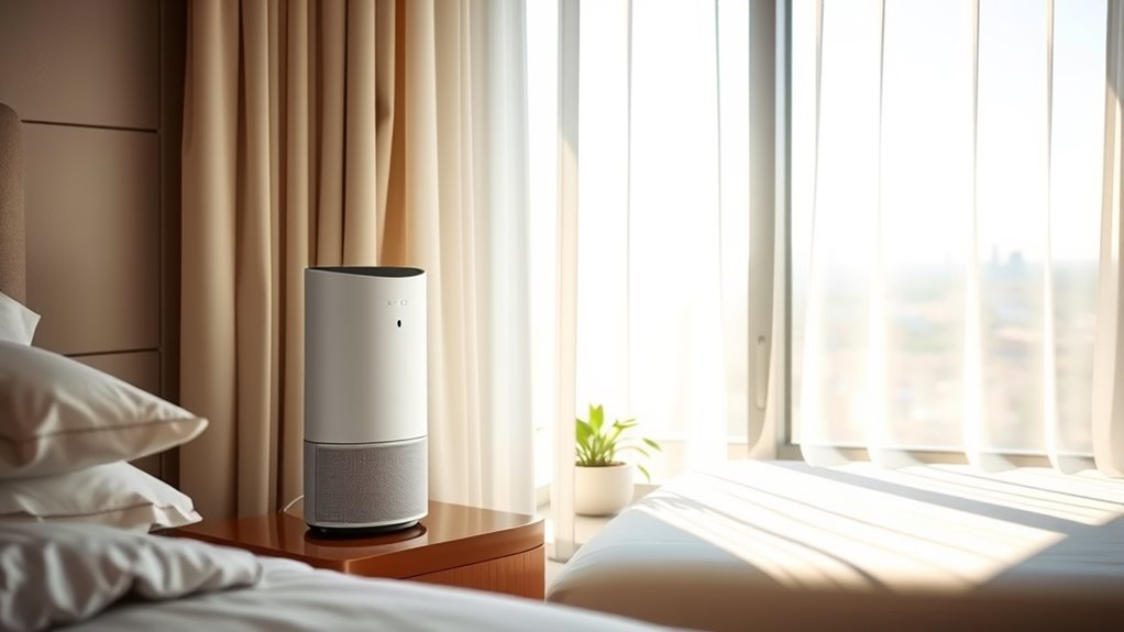 While comfort and health are top priorities during your hotel stay, the noise level of an air purifier can considerably influence your overall experience. I’ve found that quieter units, operating below 30dB, are essential for a peaceful night’s sleep. Many purifiers even have a sleep mode that reduces noise to a whisper-like 15-20dB. If you’re like me and need uninterrupted rest, look for models with adjustable fan speeds; this way, you can balance purification efficiency with noise levels. Ideally, aim for units that stay below 50dB during active use. To help narrow down your choices, I recommend checking noise level certifications and user reviews, especially if you’re sensitive to sound or staying in a quiet environment.