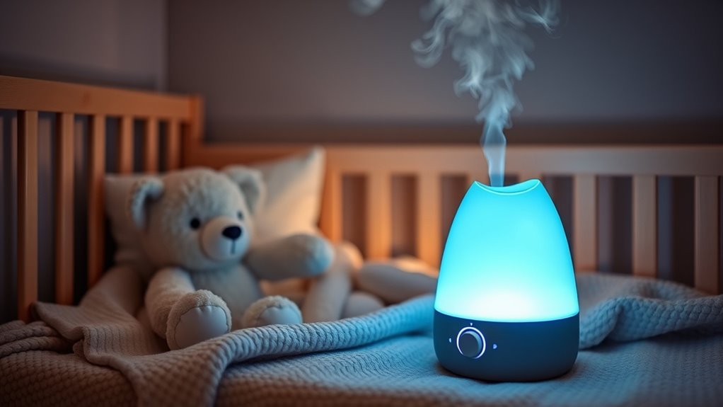 Ensuring a quiet environment in your baby’s room is crucial for restful sleep, especially when using a humidifier with a night light. Humidifiers with noise levels below 30dB are ideal, as they keep disruption to a minimum. Ultrasonic models typically operate between 20-28dB, making them perfect for peaceful nights. Some units even feature sleep modes that reduce noise further, often below 23dB, ensuring your baby remains undisturbed. Remember, lower decibel readings mean quieter operation, which is essential for creating a calming sleep atmosphere. Proper placement and regular maintenance can also help keep operational noise minimal. Choosing a humidifier with a quiet design ensures that both your baby’s comfort and sleep quality are prioritized, providing peace of mind for restful nights.