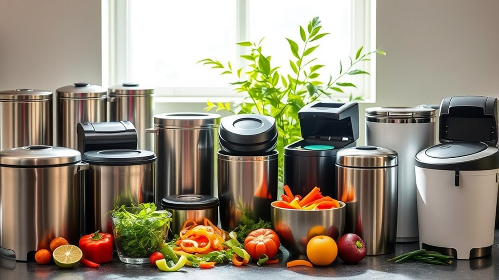 When I look for the best kitchen composters and food cyclers for eco-friendly living, I focus on features like processing time, capacity, and odor control. Models like the Airthereal Revive and GEME Bio Smart are great choices for transforming scraps into compost quickly and efficiently. I also consider energy efficiency and ease of maintenance, like auto-cleaning functions and dishwasher-safe parts. Stick around, and you’ll discover even more options to suit your sustainable lifestyle!