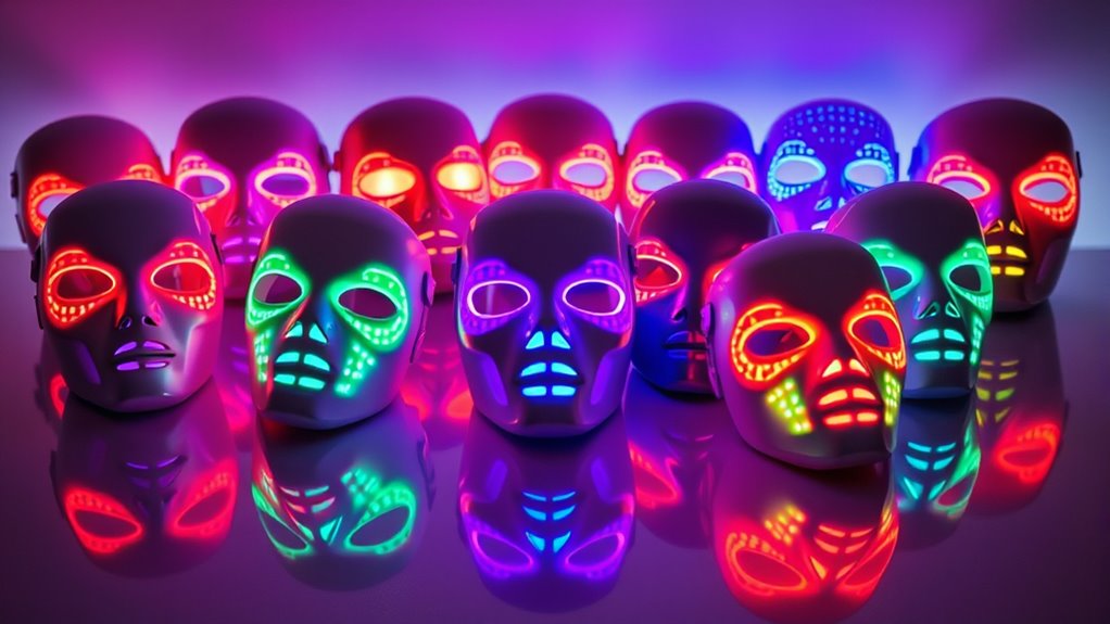 If you’re looking to upgrade your skincare routine, I recommend checking out the 15 best LED light-therapy face masks. These masks feature advanced wavelengths, like red, blue, and near-infrared, to target issues like wrinkles, acne, and dullness. They offer customizable modes, are comfortable to wear, and are designed for home use. If you want to discover which device best fits your needs and how to maximize results, there’s a lot more to explore ahead.