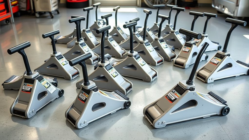 If you’re looking for the best low-profile aluminum floor jacks that make lifting easier and safer, I recommend considering models with lightweight aluminum construction, wide lifting ranges, and safety features like overload protection and rubber saddles. These jacks support vehicles from sports cars to trucks, are easy to maneuver, and come with durable builds to last. To find the perfect fit for your needs, check out the top options, and you’ll discover which models stand out for safety, portability, and efficiency.