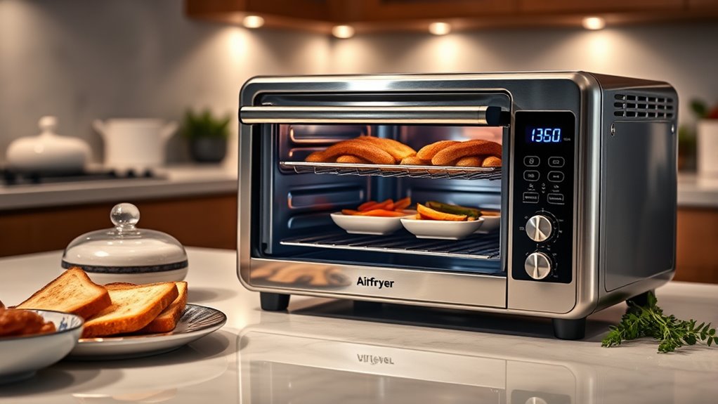 Ensuring safety and durability is essential when selecting a luxury toaster oven with air fryer functionality, especially given the high-tech features many models boast. Look for models with safety features like automatic shut-off, heat-resistant seals, and safety stops to prevent accidents. Choose appliances made from durable materials such as stainless steel or high-quality alloys, which withstand frequent use and resist wear. Verify that the electrical components are reliable, with overload protection and stable power connections to reduce overheating risks. Easy-to-clean surfaces and accessories, like dishwasher-safe trays, help maintain hygiene and prevent buildup that could compromise safety. Lastly, opt for units with robust door seals and sturdy hinges to guarantee long-term durability and safe, secure operation over time.