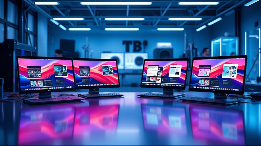 Software strategies greatly sharpen my Mac Studio’s speed and stability. I optimize with streamlined system settings, disable unnecessary startup items, and keep macOS updated. Clearing caches and managing storage prevent sluggishness, while optimizing permissions ensures smooth operation. I also leverage performance-enhancing apps and automate routine tasks, which maximize my Mac’s power and potential. These tactics transform my Mac Studio into a powerhouse of productivity and performance.