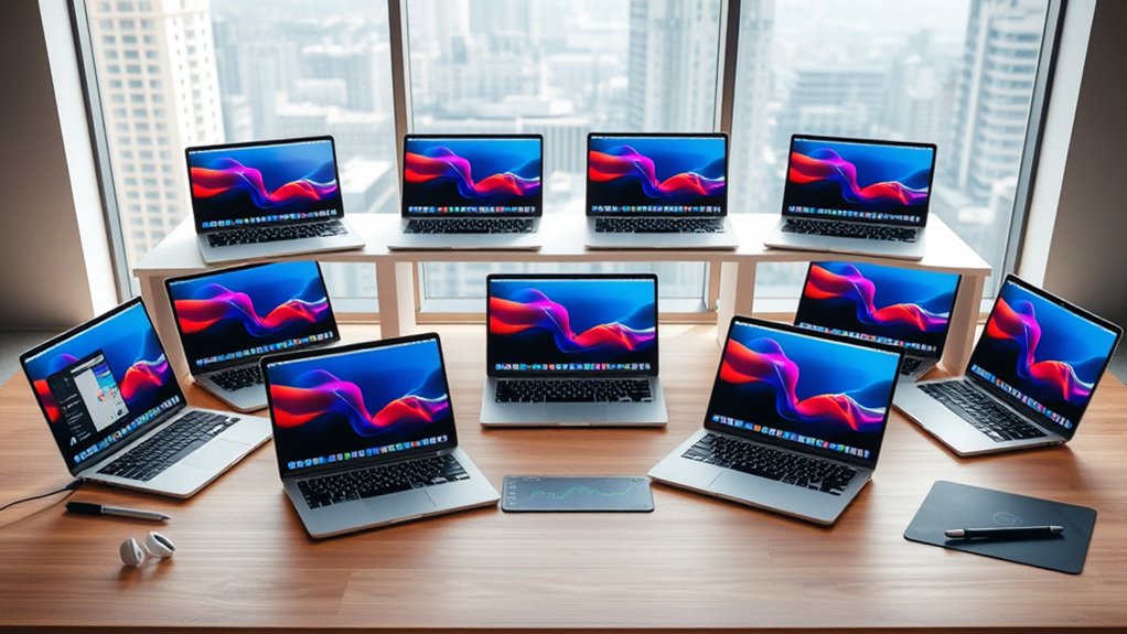 Choosing a MacBook Pro that integrates seamlessly with your other Apple devices can considerably boost your productivity and simplify your daily workflow. Ecosystem compatibility guarantees smooth interaction between your MacBook Pro, iPhone, iPad, and Apple Watch. Features like Handoff, AirDrop, and Continuity make sharing files, tasks, and media effortless, saving you time. The Universal Clipboard allows you to copy on one device and paste on another instantly, which is a game-changer during busy college days. Compatibility with Apple’s ecosystem also grants access to exclusive services like iMessage, FaceTime, and iCloud synchronization, keeping everything connected and synchronized. This tight integration reduces setup time and streamlines multitasking, making your workflow more efficient and less stressful. For college power users, ecosystem compatibility is a vital factor when choosing the right MacBook Pro.