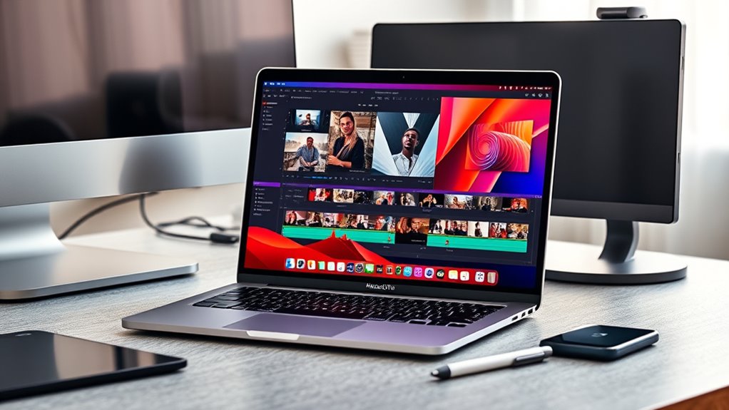 Choosing a MacBook Pro for video editing means ensuring it can smoothly run the software I rely on daily. I verify that it supports the latest versions of key programs like Final Cut Pro, Adobe Premiere Pro, and DaVinci Resolve, so I avoid compatibility issues. Sufficient RAM—at least 16GB—is essential for handling high-resolution footage and multitasking efficiently. I also check the GPU specs, favoring models with dedicated graphics or hardware-accelerated features for smooth rendering and real-time playback. The display matters too—I want P3 wide color gamut, True Tone technology, and high brightness for accurate color grading and HDR content. Finally, fast storage options like high-speed SSDs are vital for quick file access and efficient rendering, keeping my workflow seamless.