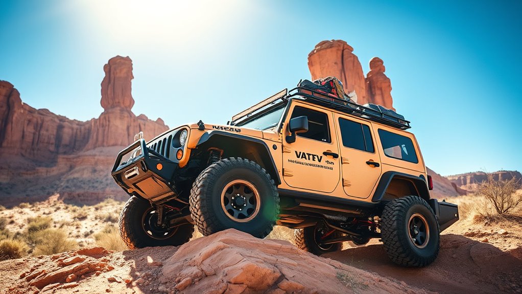 I recommend starting by evaluating the terrains you’ll encounter most often. For rocky trails, prioritize skid plates and off-road tires for protection and grip. Muddy or sandy areas call for high-clearance lifts and wide tires to prevent getting stuck. I always suggest carrying essentials like recovery gear for unpredictable conditions. By matching accessories to terrain specifics, you’ll enhance safety and performance, making every adventure smoother and more enjoyable.