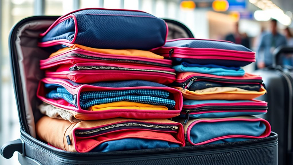 Packing cubes positively impact your suitcase weight limits by promoting precise packing and preventing overstuffing. I find that organized cubes help me streamline my belongings, reducing excess weight and space. By packing smarter, I avoid exceeding airline limits, saving stress and surcharges. Efficiently filled cubes maximize space, so I can pack lighter and travel lighter, ensuring I stay within weight restrictions while still fitting everything I need comfortably.