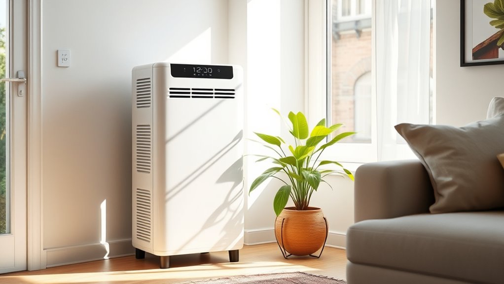 Selecting the right PCO photocatalytic air purifier requires paying close attention to its recommended coverage area. I always check the manufacturer’s specified square footage to guarantee the unit matches my space. It’s essential to choose a purifier designed for small, medium, or large rooms—typically ranging from 200 sq ft to over 3,000 sq ft. If the purifier’s coverage area is too small, it won’t effectively clean the air; too large, and it might be inefficient or unnecessary. For larger spaces, I consider multiple units or higher-capacity models to maintain ideal air quality. Matching the device’s recommended room size with my actual space helps maximize purification efficiency and makes sure I get the best performance from my investment.