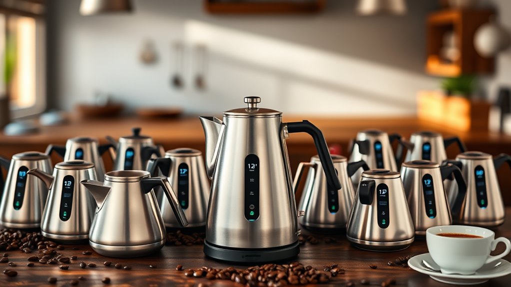 When I’m on the hunt for the best pour-over kettles with variable temperature control, I prioritize features like precise gooseneck spouts and quick heating. Models like the Govee Smart Electric Kettle and the COSORI Electric Gooseneck Kettle stand out for their customization options and safety features. I love the variety in capacity and materials, ensuring I can brew my perfect cup of coffee or tea. Stick around to find out more about my top recommendations!