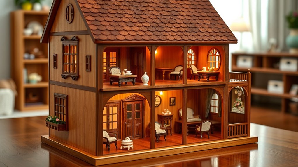 The design and aesthetic of a wooden dollhouse play a essential role in creating an inviting and inspiring play environment. I look for sets that match the child’s style, whether modern, vintage, or Nordic-inspired, and blend well with home decor. The color palette is key: soft pastels promote calmness, while vibrant hues add energy. Realistic details like miniature mirrors, functioning doors, and textured surfaces boost authenticity and engagement. A cohesive look across rooms and furniture encourages imaginative storytelling and role-playing. Safety is also crucial; I prioritize designs with rounded edges and child-friendly materials that don’t compromise on style. Ultimately, a well-designed, aesthetically pleasing dollhouse sparks creativity and makes playtime truly special.