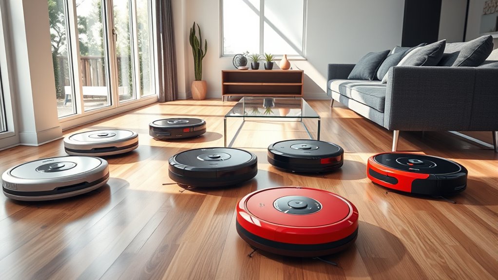 Choosing the right robotic vacuum involves more than just looking at the sticker price; you need to contemplate overall cost and long-term value. I consider both the initial purchase and ongoing expenses like replacement filters or bags. It’s important to compare features and cleaning performance relative to the price to find a model that truly fits my needs. Higher-priced vacuums often include advanced navigation, self-emptying, and multi-surface cleaning, which can save time and reduce maintenance costs over time. Cheaper options may lack essential features like app control or obstacle avoidance, potentially requiring extra purchases later. Balancing my budget with the vacuum’s durability, efficiency, and potential for time savings helps me choose a model that offers the best value for my investment.