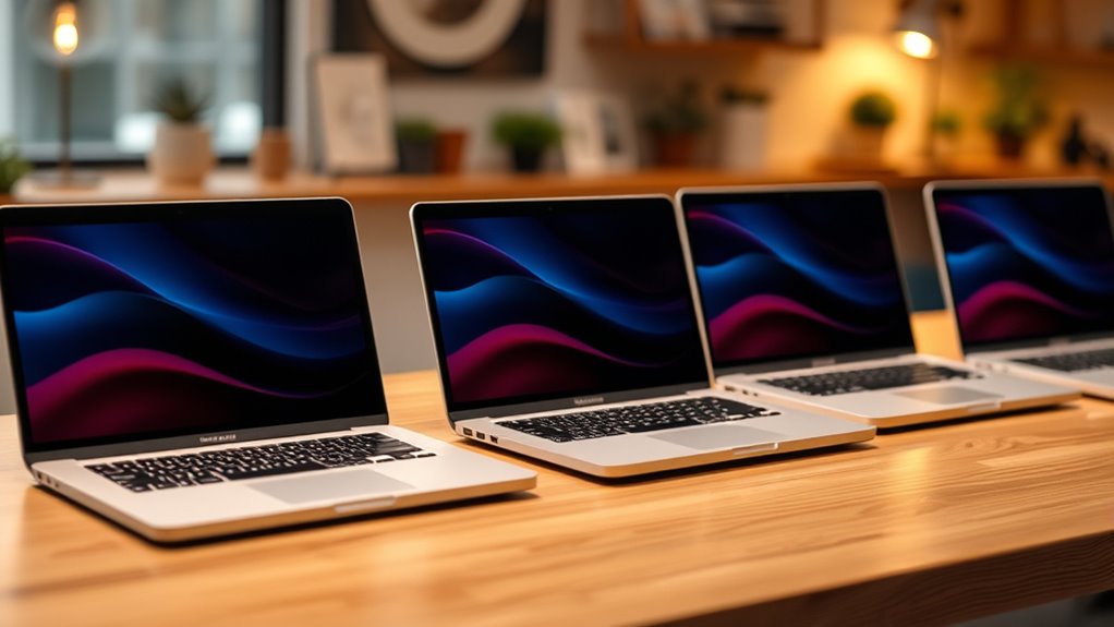 Performance capabilities are a key factor to contemplate in silent fanless MacBooks for travel, especially if you plan to handle demanding tasks on the go. Apple Silicon chips like the M4 provide impressive power without the need for active cooling, making these devices ideal for intensive work. They support tasks such as video editing, multitasking, and high-resolution graphics thanks to hardware-accelerated media engines and robust GPUs. The 16-core Neural Engine boosts machine learning, allowing faster processing for AI-driven workflows. Advanced thermal management ensures sustained performance without thermal throttling during extended use. Plus, high-speed memory and rapid storage options enable smooth operation and quick data access, even under heavy workloads. All these factors make silent fanless MacBooks surprisingly capable for professional and creative tasks while maintaining quiet operation.