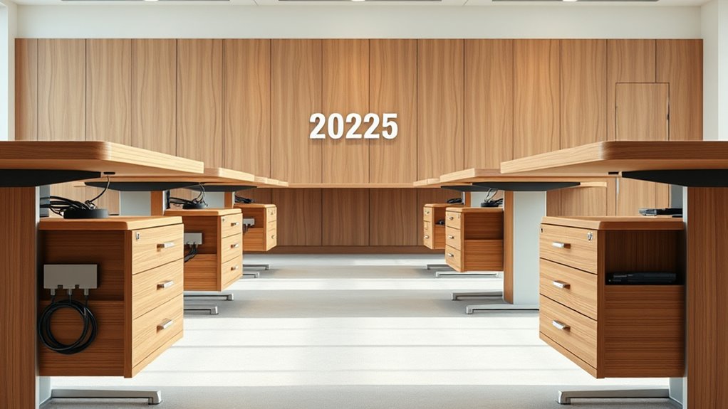 If you’re looking for the best sit-stand desks with cable management drawers for a tidy workspace in 2025, I’ve found several great options. These desks feature adjustable heights, sturdy construction, ample storage, and built-in cable management solutions like trays, clips, and drawers. Many also include wireless charging, USB ports, and easy assembly. To discover the top models that combine form and function for a clutter-free setup, keep exploring further.