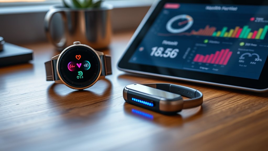 Your health data stored on these devices is generally secure, but it varies by manufacturer. I recommend checking the device’s security features, like encryption and data privacy policies. I always guarantee my devices have strong passwords and keep software updated. While no system is completely foolproof, reputable brands prioritize security. Staying informed and practicing good cybersecurity habits helps me protect my sensitive health information effectively.