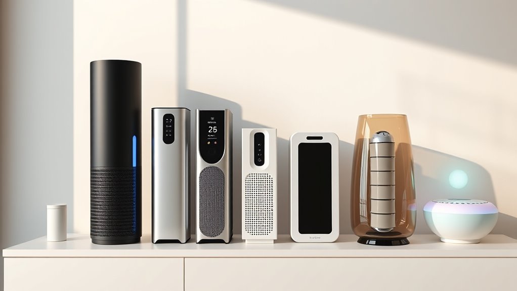 I’ve noticed some air purifiers are like skilled archers, targeting specific allergens with precision. For example, HEPA filters excel at capturing pet dander and pollen, making them ideal for allergy sufferers. Activated carbon filters are great against smoke and odors. When choosing, consider what triggers your allergies—this way, your purifier becomes a tailored shield, effectively targeting your most bothersome allergens for cleaner, healthier air.