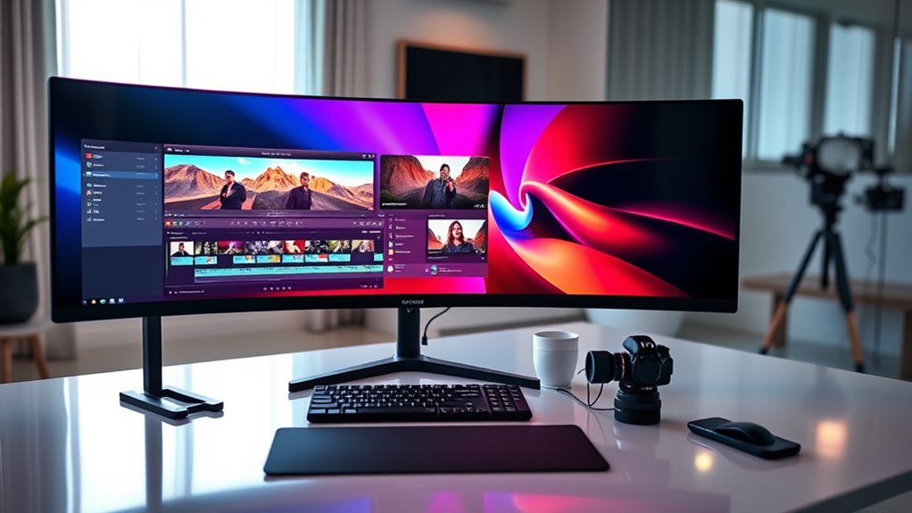 If you’re looking for the best ultrawide monitors in 2025 for video editing and multitasking, I recommend checking out options that combine high resolution, excellent color accuracy, and fast performance. Monitors like the Samsung Odyssey G5, LG QHD Curved Smart Monitor, and ASUS ProArt 34” are top contenders, offering immersive screens and professional-grade features. Keep in mind factors such as size, connectivity, and adaptive sync. Explore further to find the perfect fit for your workflow.