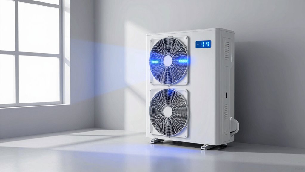 Choosing a UV light air purifier that works seamlessly with your HVAC system requires careful consideration of compatibility factors. First, verify the unit matches your system type—whether it’s central air, a furnace, or ducted units. Check the wattage and UV wavelength, typically around 254nm or 253.7nm, to ensure effective sterilization without damaging your equipment. The UV fixture must fit within your ductwork, air handler, or furnace without blocking airflow or access points. Confirm whether it needs to be plugged into a wall outlet or wired directly into your HVAC system, and verify that the size and airflow capacity align with your system’s specifications. Proper compatibility guarantees effective sterilization and smooth operation without interference or maintenance issues.