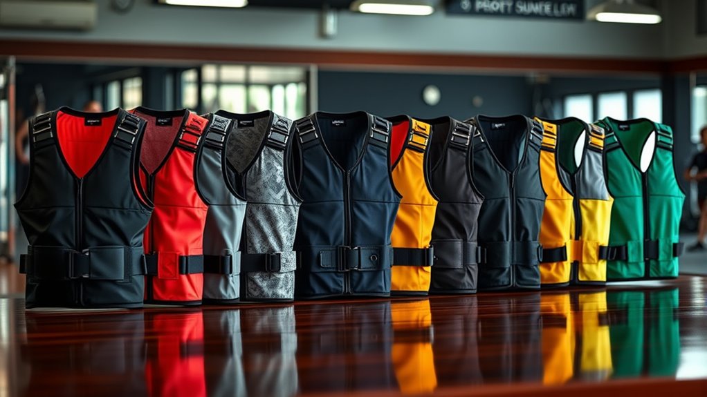 Choosing a weighted vest that offers adjustable weights can considerably enhance your endurance training experience. I’ve found that vests with multiple weight options, ranging from 4 lbs to over 100 lbs, allow me to tailor resistance to my specific needs. Many models feature removable weights or modular components, making it easy to customize and gradually increase my load as my endurance improves. The ability to adjust weights mid-workout means I can vary intensity levels, which is great for interval or circuit training. Plus, adjustable straps and removable iron blocks provide the flexibility I need for different training phases. Proper weight *modifiability* not only ensures a balanced load but also reduces the risk of injury, enhancing my overall training effectiveness.
