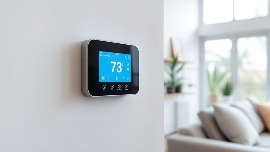 Smart thermostats include security features like encrypted data transmission, secure Wi-Fi connections, and regular firmware updates to protect your data. I always look for models with two-factor authentication and robust password protections, which add extra layers of security. These features help guarantee my personal information and home data stay safe from hacking attempts. Trusting a thermostat with strong security measures gives me peace of mind while enjoying smart home convenience.