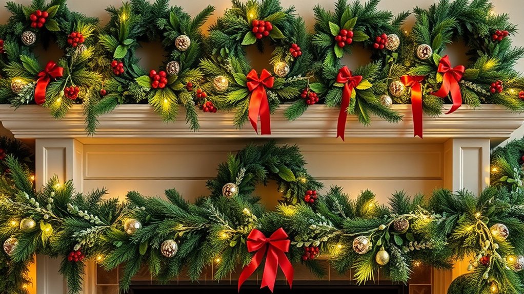 Choosing the right size for wreaths and garland sets is essential to creating a balanced and appealing mantel display. First, measure your mantel’s length and height to ensure the decor fits well without overpowering or looking too small. A wreath or garland that’s proportionate to your mantel’s dimensions will create a harmonious look. For wider mantels, go for larger wreaths or longer garlands, typically 24 inches or more, to fill the space effectively. Also, consider the overall room decor—select a size that complements other design elements without overwhelming them. Always verify product dimensions and shapes before purchasing to make sure it will comfortably fit and enhance your mantel’s aesthetic. Proper sizing is key to a stunning holiday display.