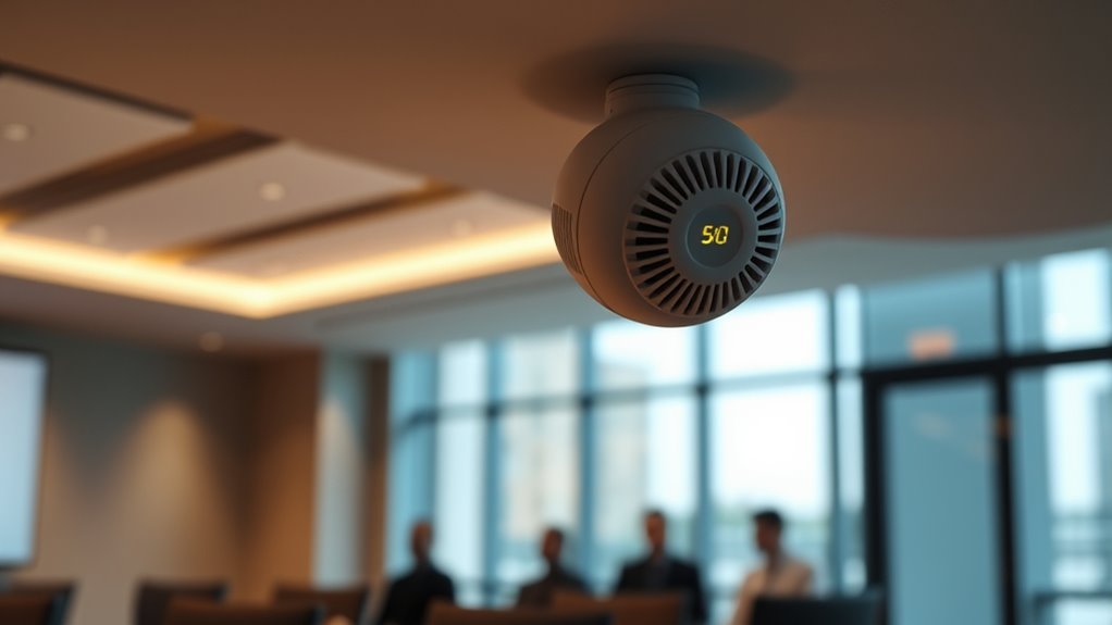 In large open spaces, CO2 sensors face limitations like uneven air circulation, which can cause inaccurate readings, and sensor calibration issues that affect reliability. You might find that CO2 levels don’t reflect actual occupancy accurately because air mixes poorly or sensors drift over time. To improve accuracy, verify proper air circulation and regularly calibrate sensors, but remember they still can’t precisely determine individual occupancy or account for ventilation variations.