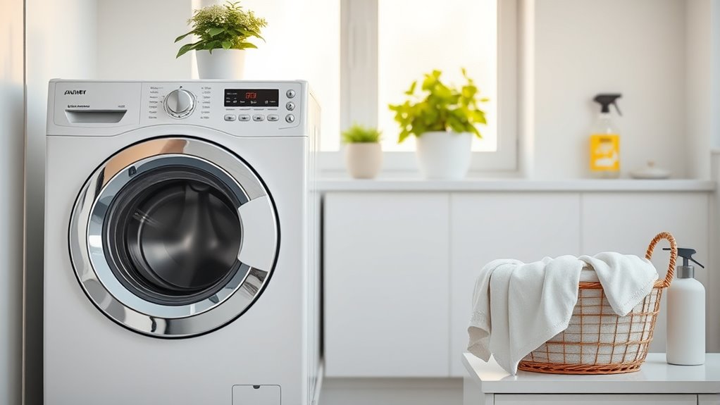 To combat musty smells in your laundry room, focus on improving ventilation by installing or upgrading exhaust fans, opening windows regularly, and ensuring vents are clear. Control moisture levels with dehumidifiers, fix leaks promptly, and keep surfaces clean with vinegar or mold cleaner. Avoid overloading the washer and dry items thoroughly. Maintaining good housekeeping habits will help prevent odors, and if you keep these tips in mind, you’ll discover even more effective ways to keep your laundry area fresh.