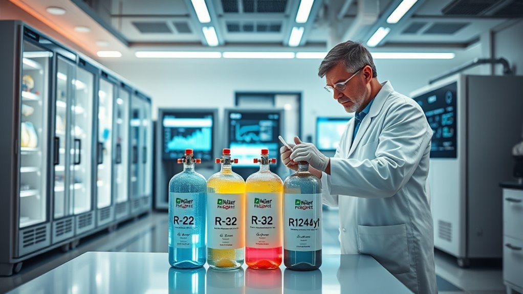 Switching from R-22 to eco-friendly refrigerants like R-32 and R-1234yf can substantially lower your system’s environmental impact. R-32 has a third of R-410A’s GWP, while R-1234yf’s GWP is less than 1, making them ideal choices for reducing greenhouse gases. This change supports regulatory compliance and advances sustainability efforts. By adopting these refrigerants, you help protect the planet and improve system efficiency—discover more about how this shift benefits your systems and the environment.