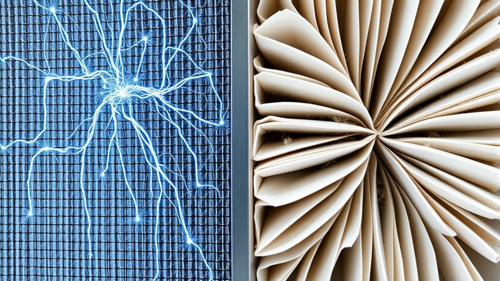 When choosing between electrostatic and mechanical filtration, consider their efficiency and maintenance needs. Electrostatic filters trap pollutants using static electricity and are reusable with proper cleaning, offering long-term savings. Mechanical filters rely on dense fiber media to trap particles and often need regular replacement to stay effective. While electrostatic filters handle small particles well, mechanical filters excel at removing larger debris. To find out which option best fits your environment and maintenance preferences, explore the details below.